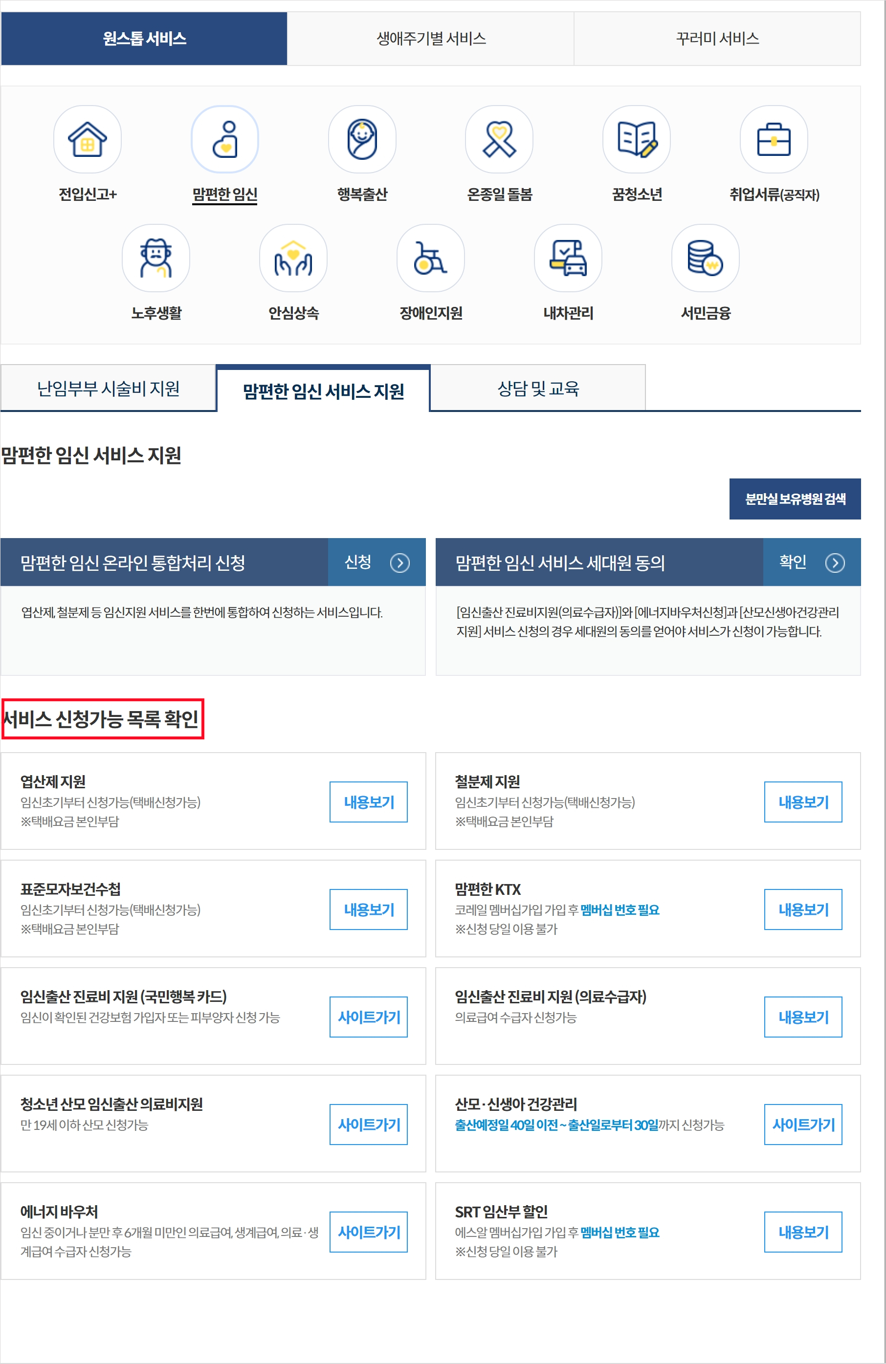 원스톱 서비스에서는 엽산·철분제·임신출산진료비 지원 등 다른 서비스와 동시에 신청이 가능합니다. 만약 다른 서비스만 신청되어 있는 경우는 추가 신청을 하셔야 합니다.