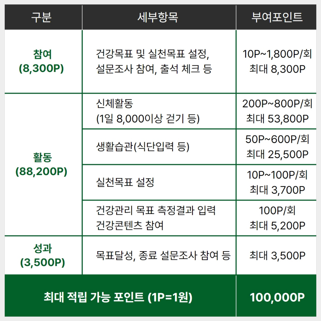 실천목표를 정하고 출석체크를 하면 1,800포인트, 하루 8,000보 이상 걸으면 200포인트, 건강퀴즈 참여 시 100포인트, 목표달성과 설문조사에 참여하면 최대 3,500포인트가 제공됩니다.