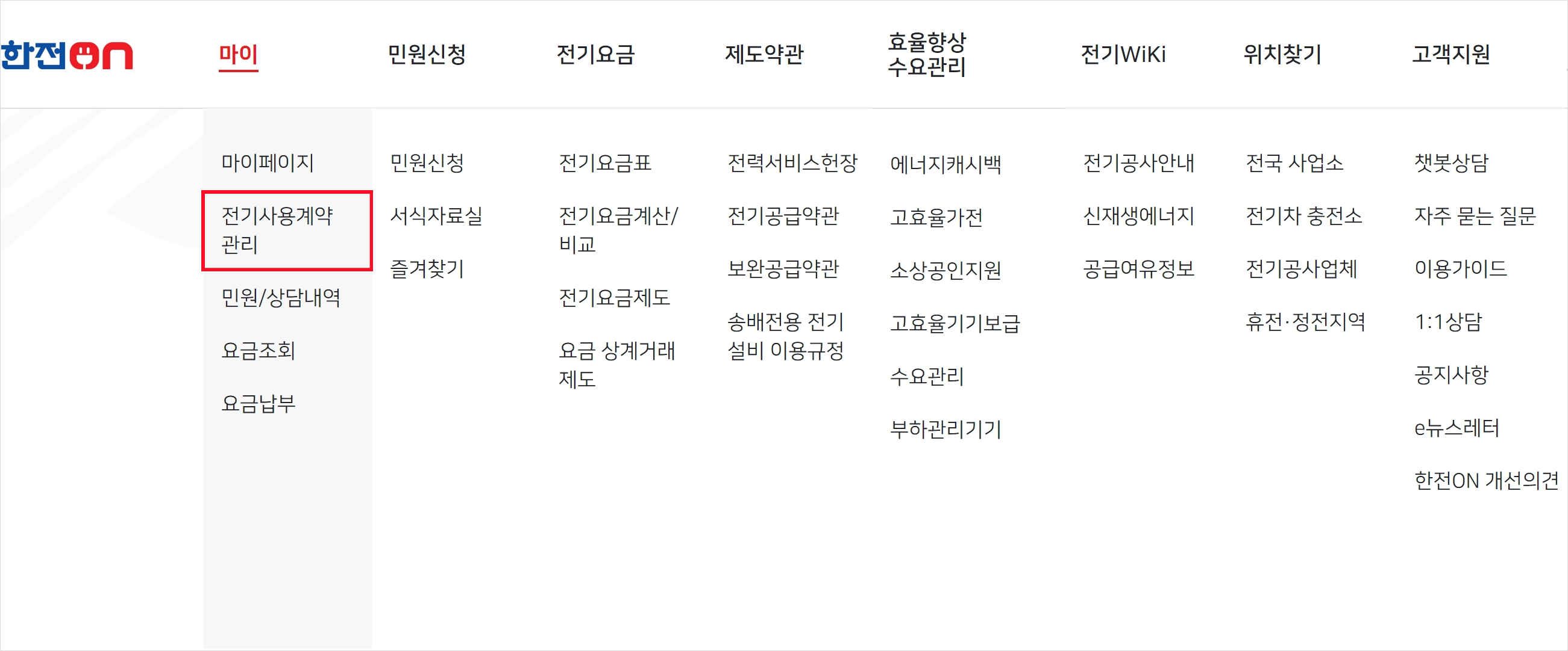 1. 한전ON홈페이지에 접속하여 '마이'메뉴에서 '전기사용계약관리'를 클릭합니다.