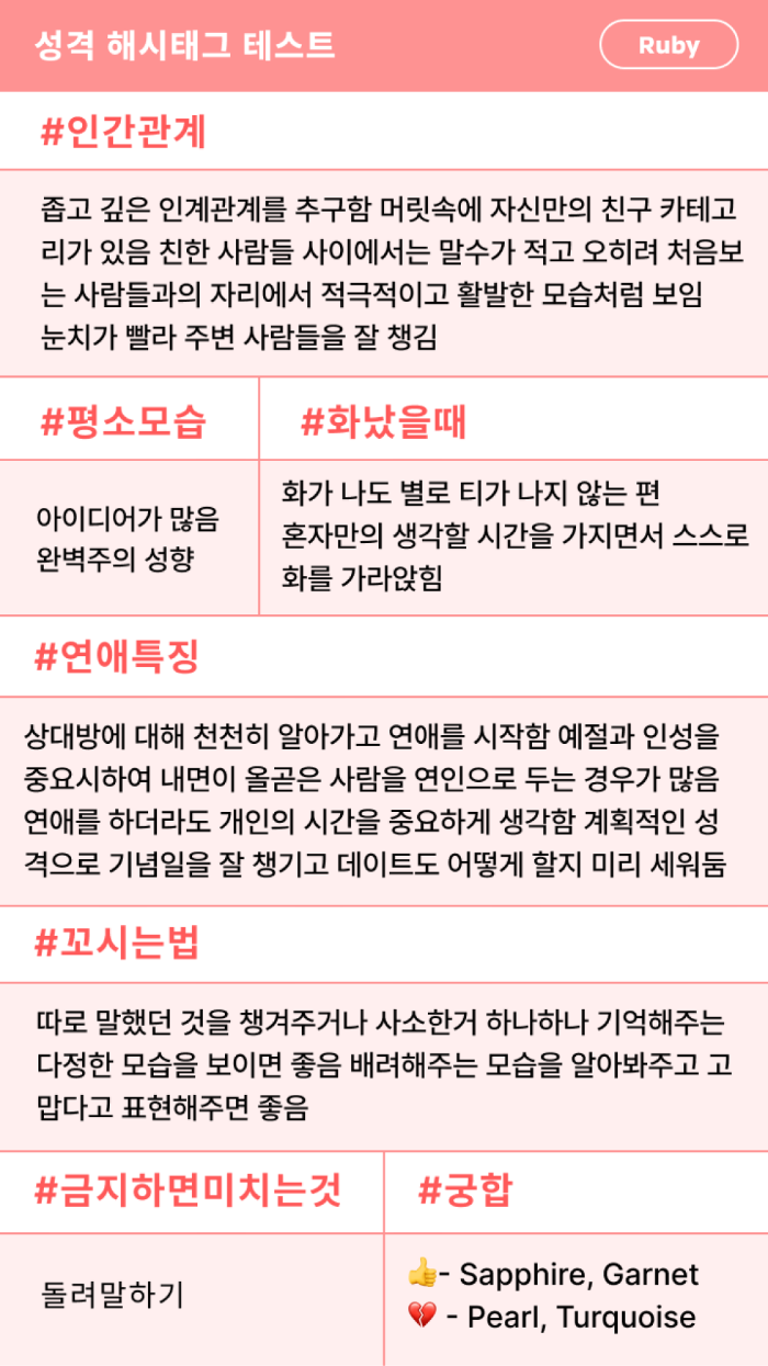 저의 성격 해시태그 테스트 결과는 루비입니다. 상세 내용은 아래에서 확인해 주세요.
