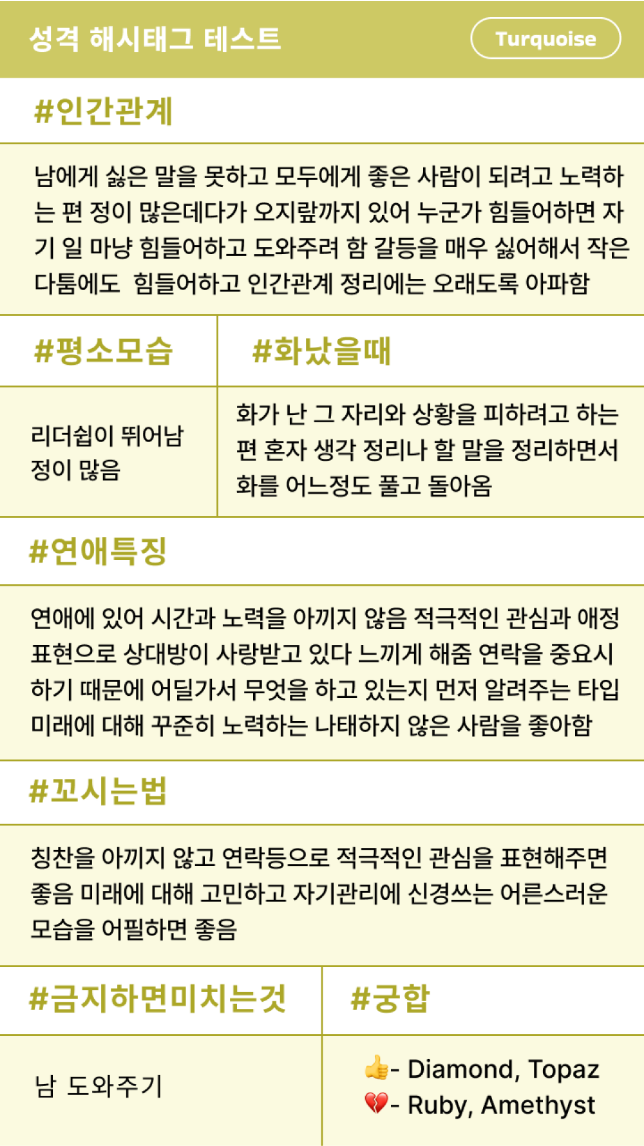 성격 해시태그 테스트 결과 터키석 - ENFJ