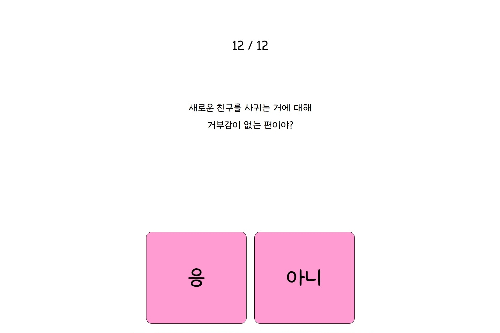 나만의 핑 테스트는 총 12가지 문항으로 이루어져 있고, 각 질문에 대해 간단히 응 또는 아니 중 하나만 선택하면 됩니다.