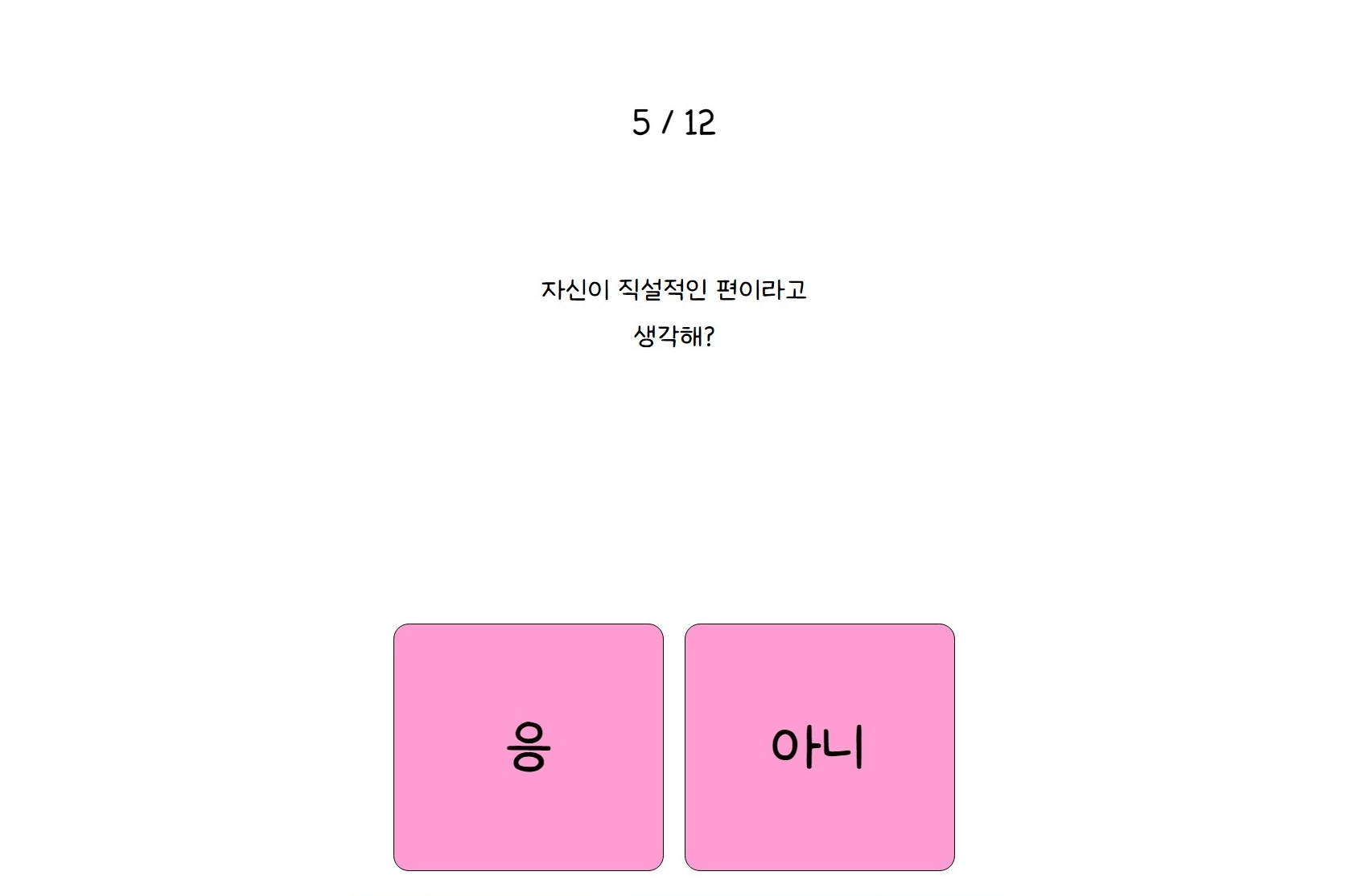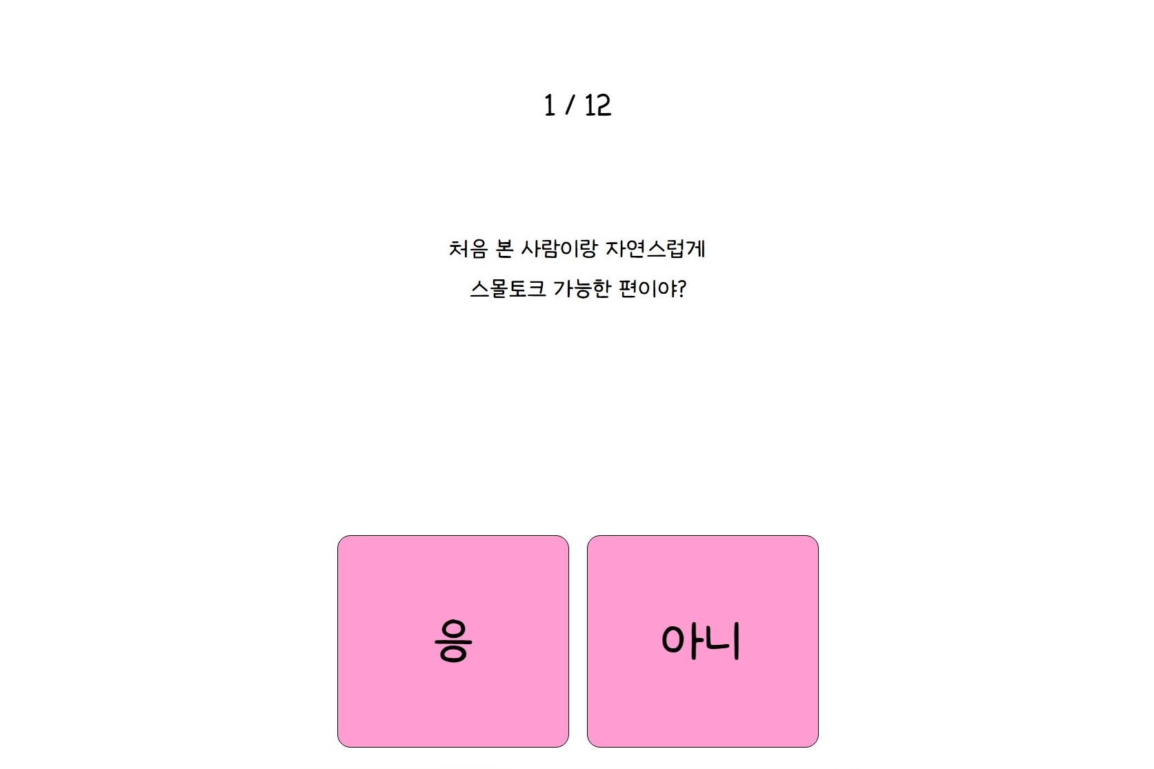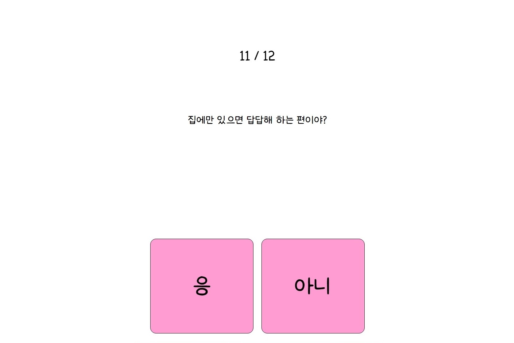 나만의 핑 테스트는 총 12가지 문항으로 이루어져 있고, 각 질문에 대해 간단히 응 또는 아니 중 하나만 선택하면 됩니다.