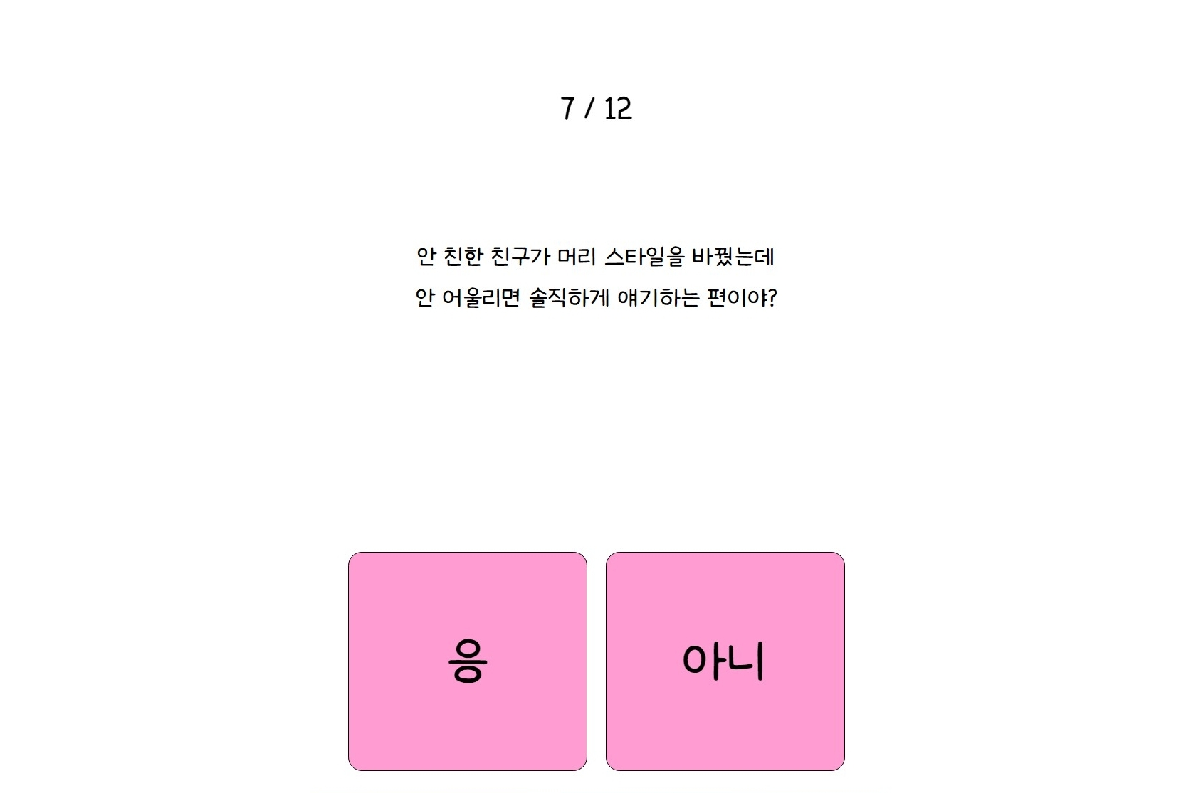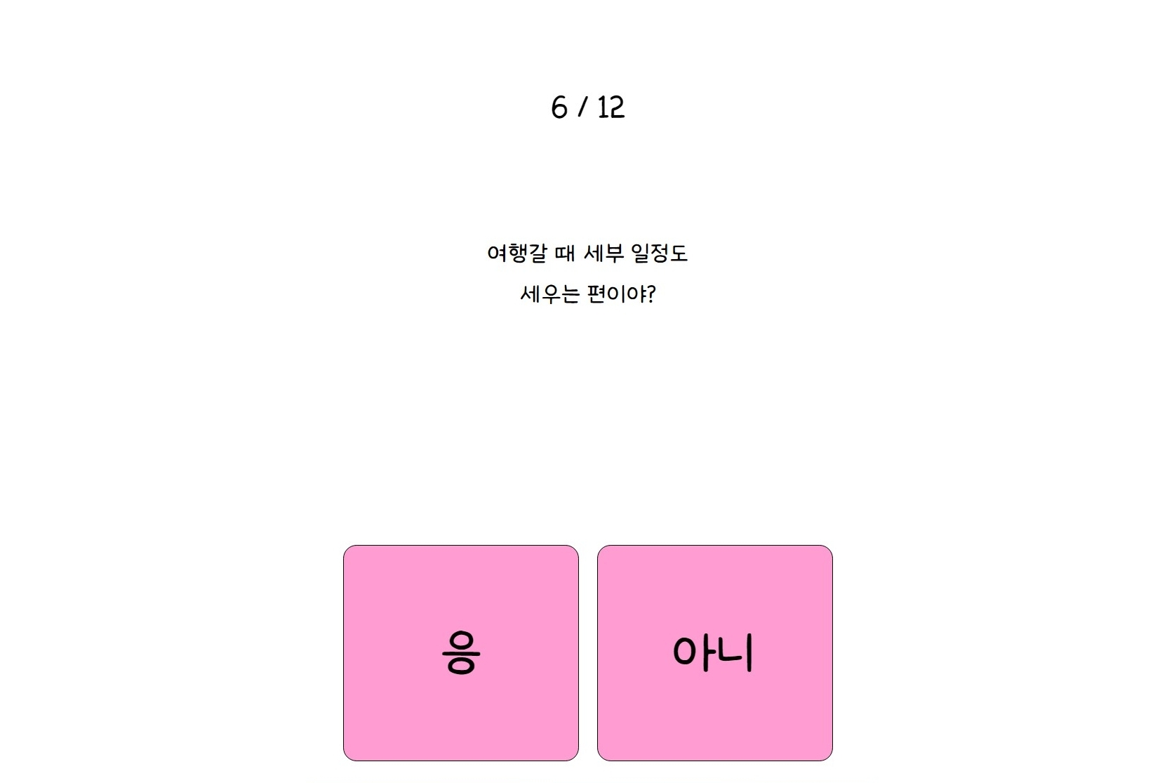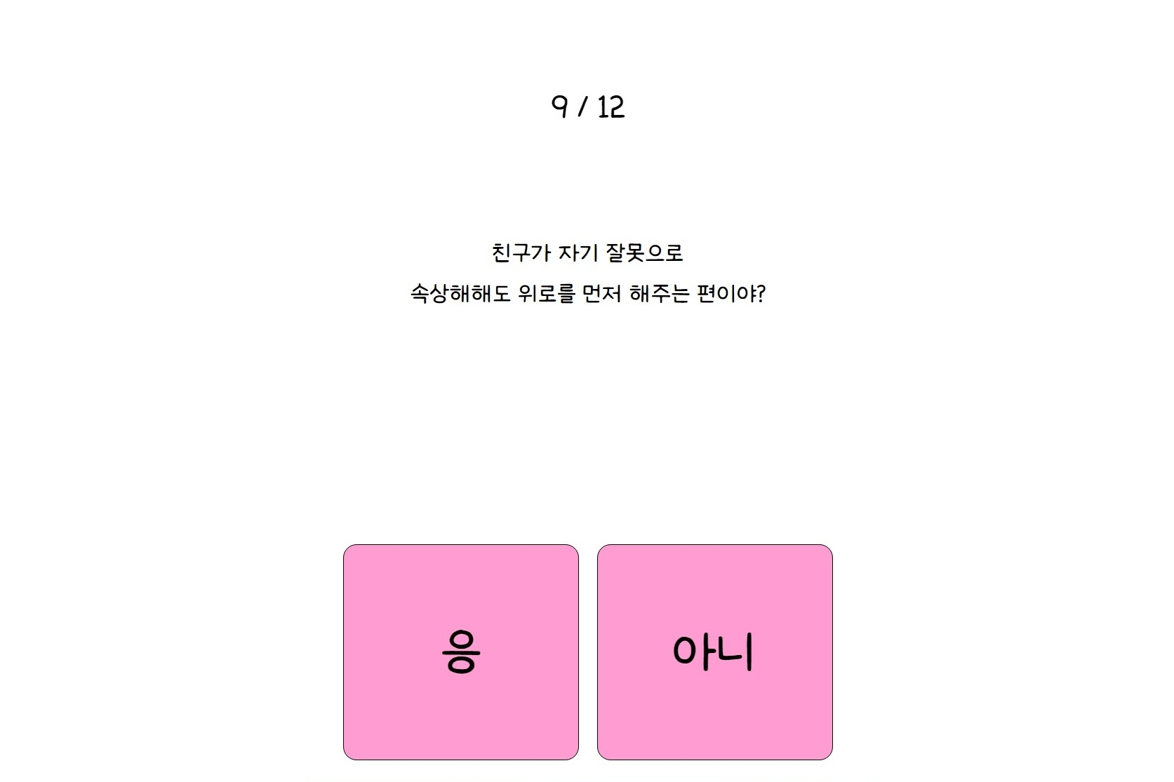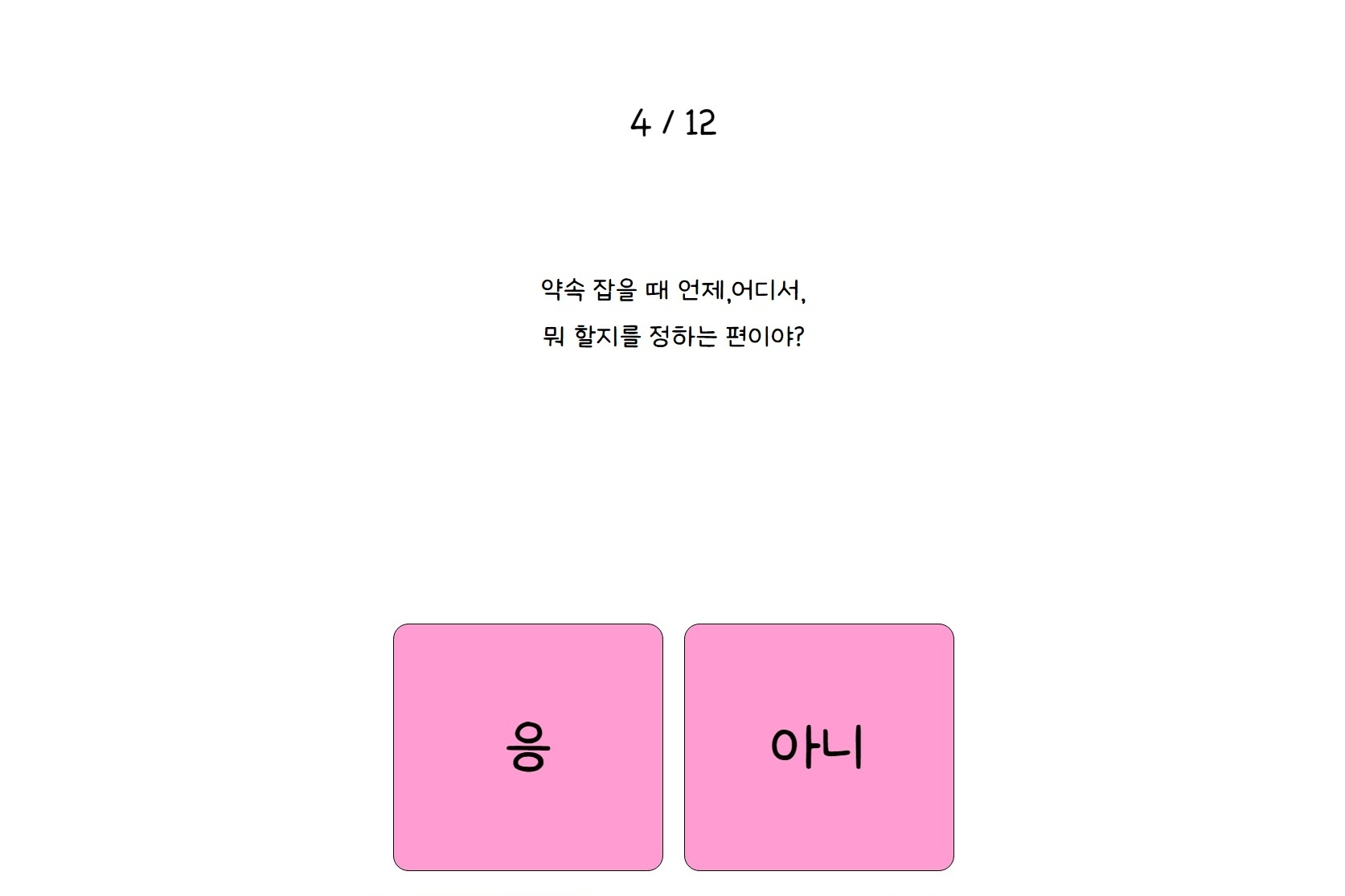 나만의 핑 테스트는 총 12가지 문항으로 이루어져 있고, 각 질문에 대해 간단히 응 또는 아니 중 하나만 선택하면 됩니다.